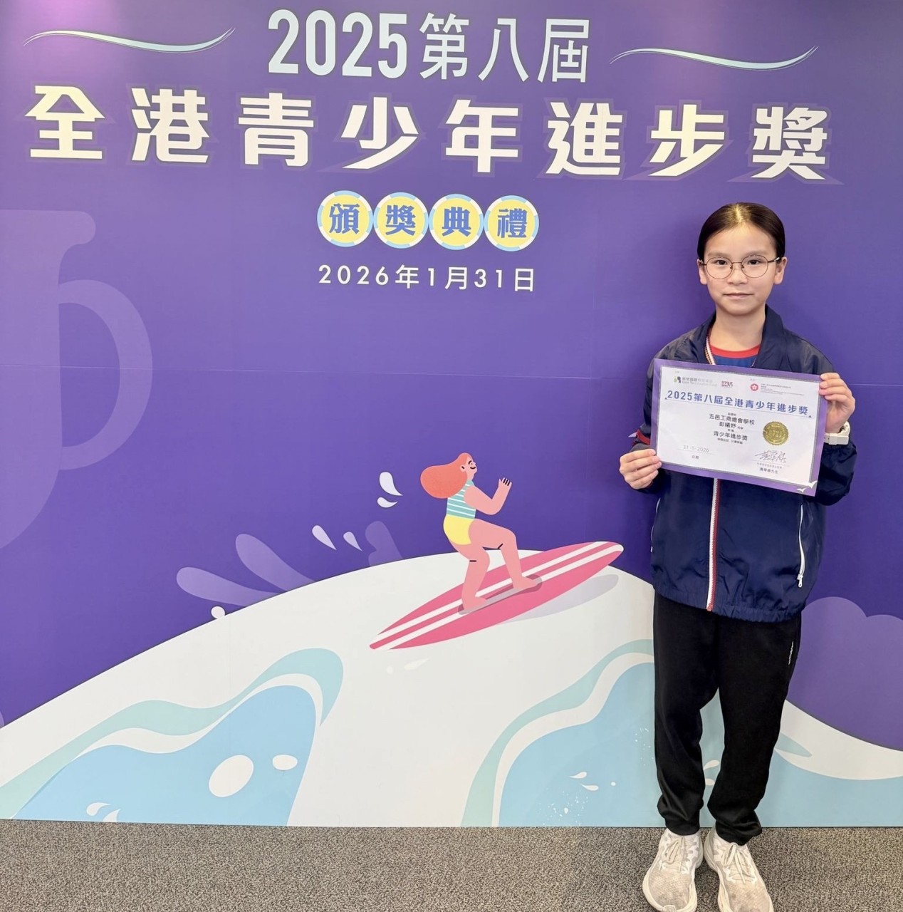 2026-01-31 活動名稱︰「第八屆全港青少年進步獎」頒獎禮 舉行日期:2026年1月31日 活動詳情︰本校6A彭曦妤同學榮獲「青少年進步獎」,並於頒獎典禮上獲頒獎狀及獎學金,以肯定她在學習與成長上的努力與成果。此外,4A謝丁杰同學及6C施雅媛同學亦獲得「進步嘉許獎」,展現出積極向上的精神。期望同學們以此為激勵,繼續努力學習,勇敢迎接挑戰,不斷追求進步,為未來奠定堅實的基礎。