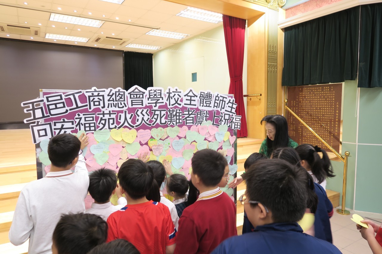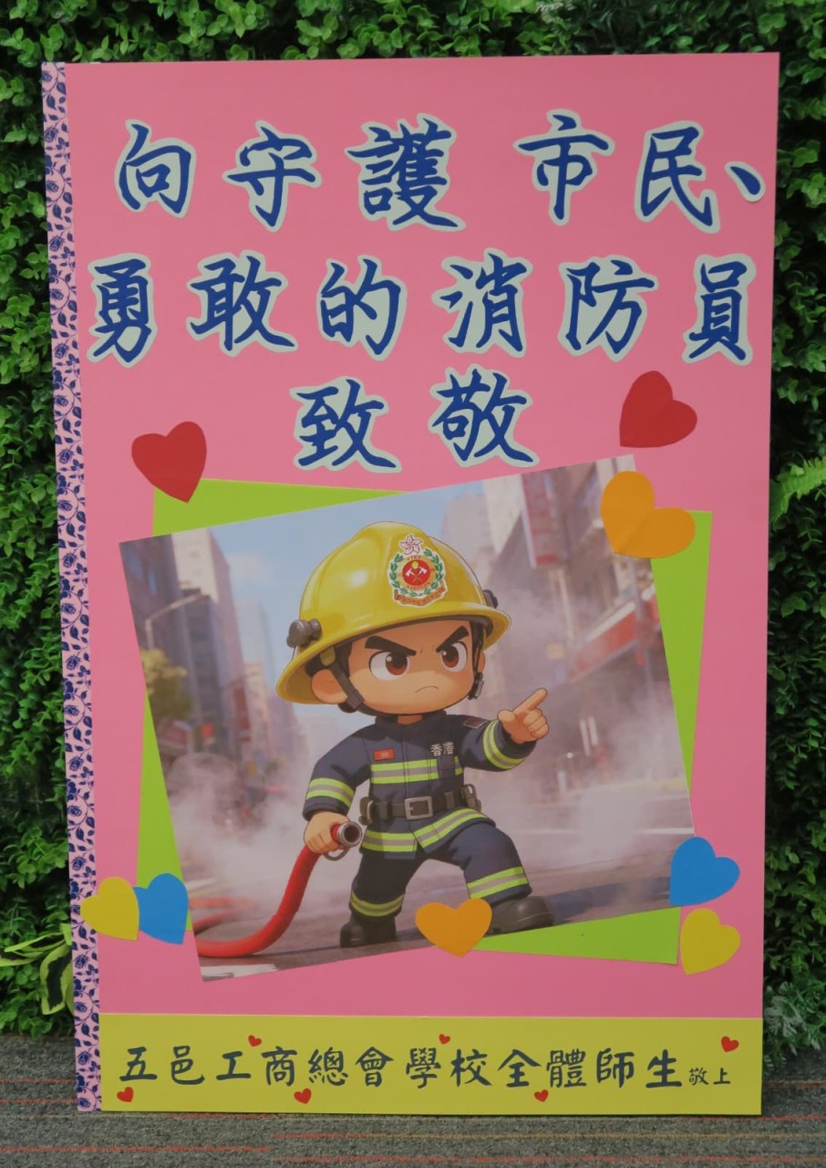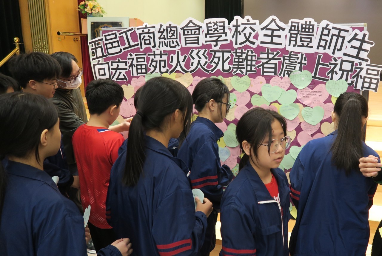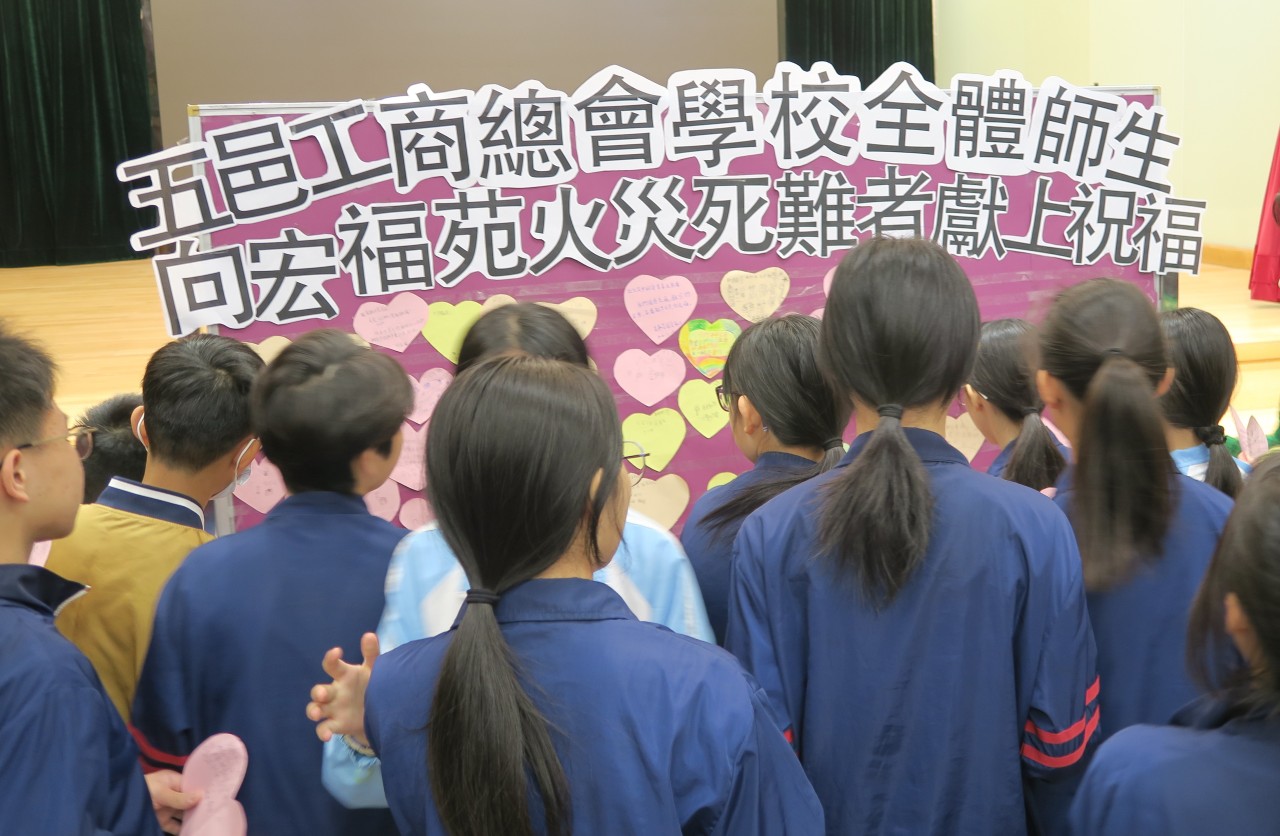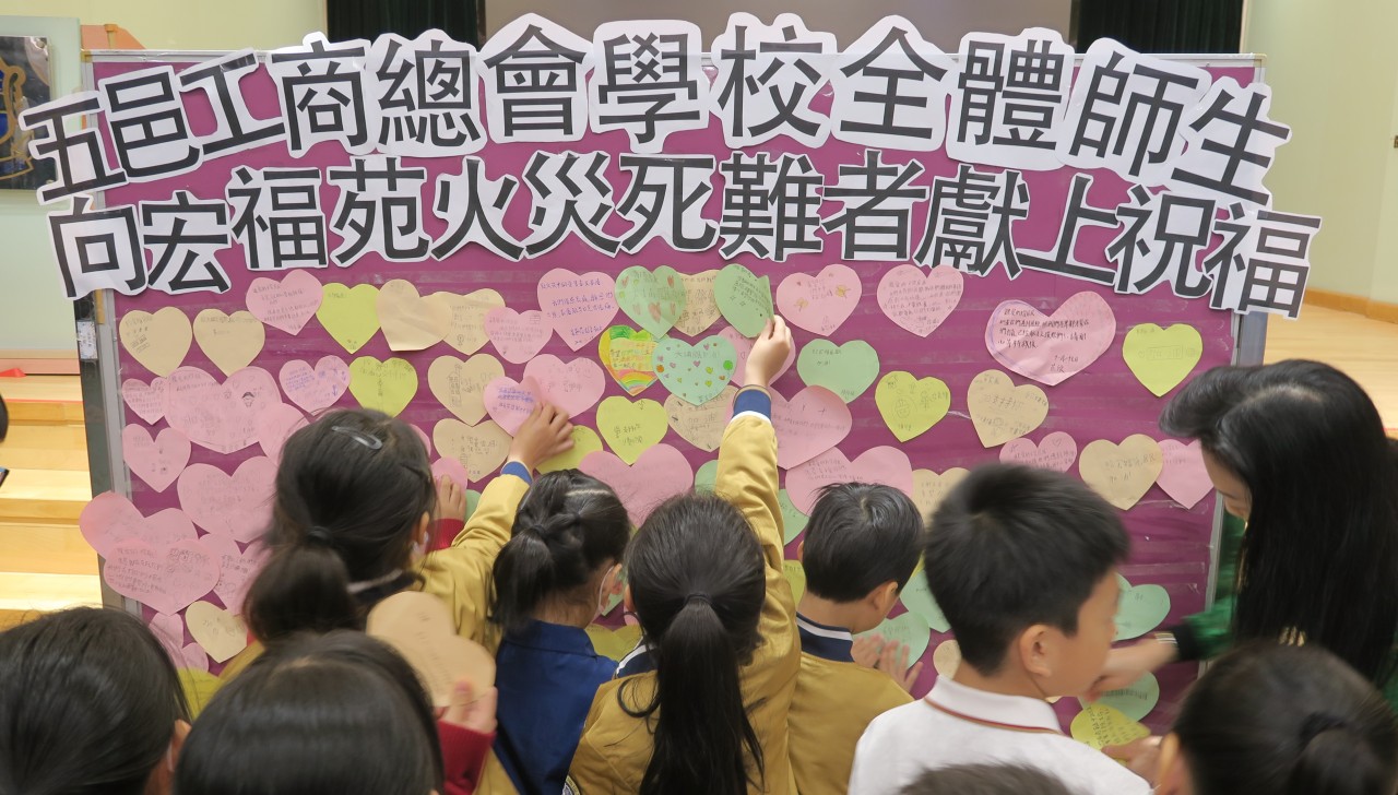 活動詳情︰昨日大埔宏福苑發生五級大火,造成多人傷亡,仍有居民失聯,消息令人難過。本校今日舉行關懷與安全教育活動,讓學生了解事件、調適情緒並提升防災意識!早會時段,校長向學生講解火災情況及防火要點,提醒珍惜生命並提高警覺!各班進行「心意傳遞」行動,學生在心意卡上寫下給災民、家屬及前線救援人員的祝福。心意卡將在禮堂展示,並送往大埔消防局,表達五邑師生的支持與感謝!校長及社工巡視班房,如發現學生情緒不安,會安排適切支援!我們希望學生在活動中學會關懷與同理,為社區送上力量與溫暖!