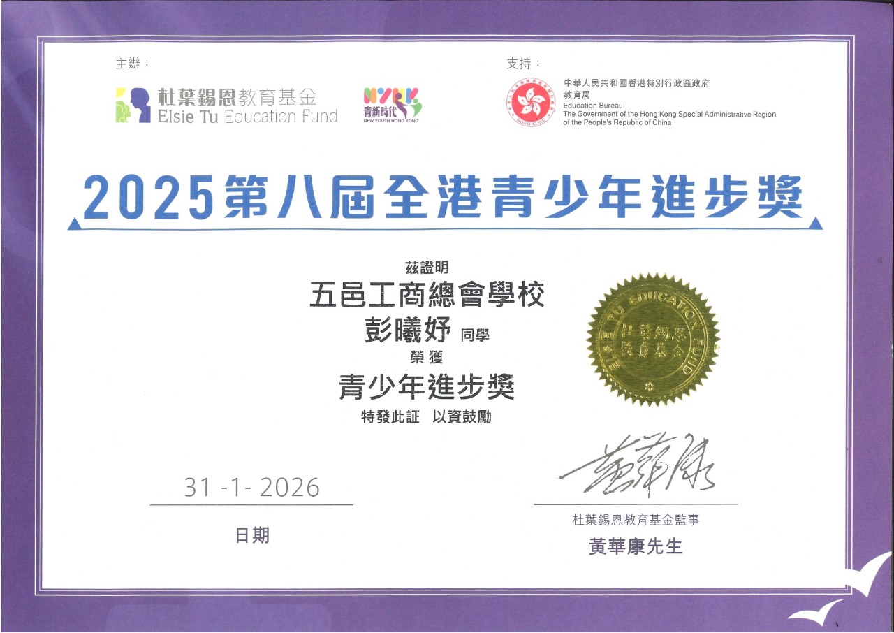 2026-01-31 活動名稱︰「第八屆全港青少年進步獎」頒獎禮 舉行日期:2026年1月31日 活動詳情︰本校6A彭曦妤同學榮獲「青少年進步獎」,並於頒獎典禮上獲頒獎狀及獎學金,以肯定她在學習與成長上的努力與成果。此外,4A謝丁杰同學及6C施雅媛同學亦獲得「進步嘉許獎」,展現出積極向上的精神。期望同學們以此為激勵,繼續努力學習,勇敢迎接挑戰,不斷追求進步,為未來奠定堅實的基礎。