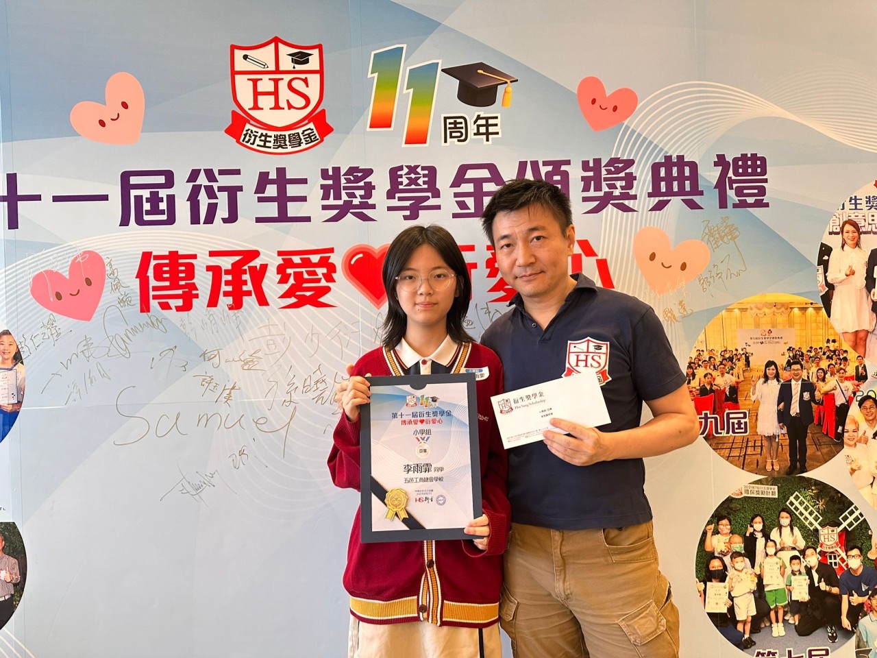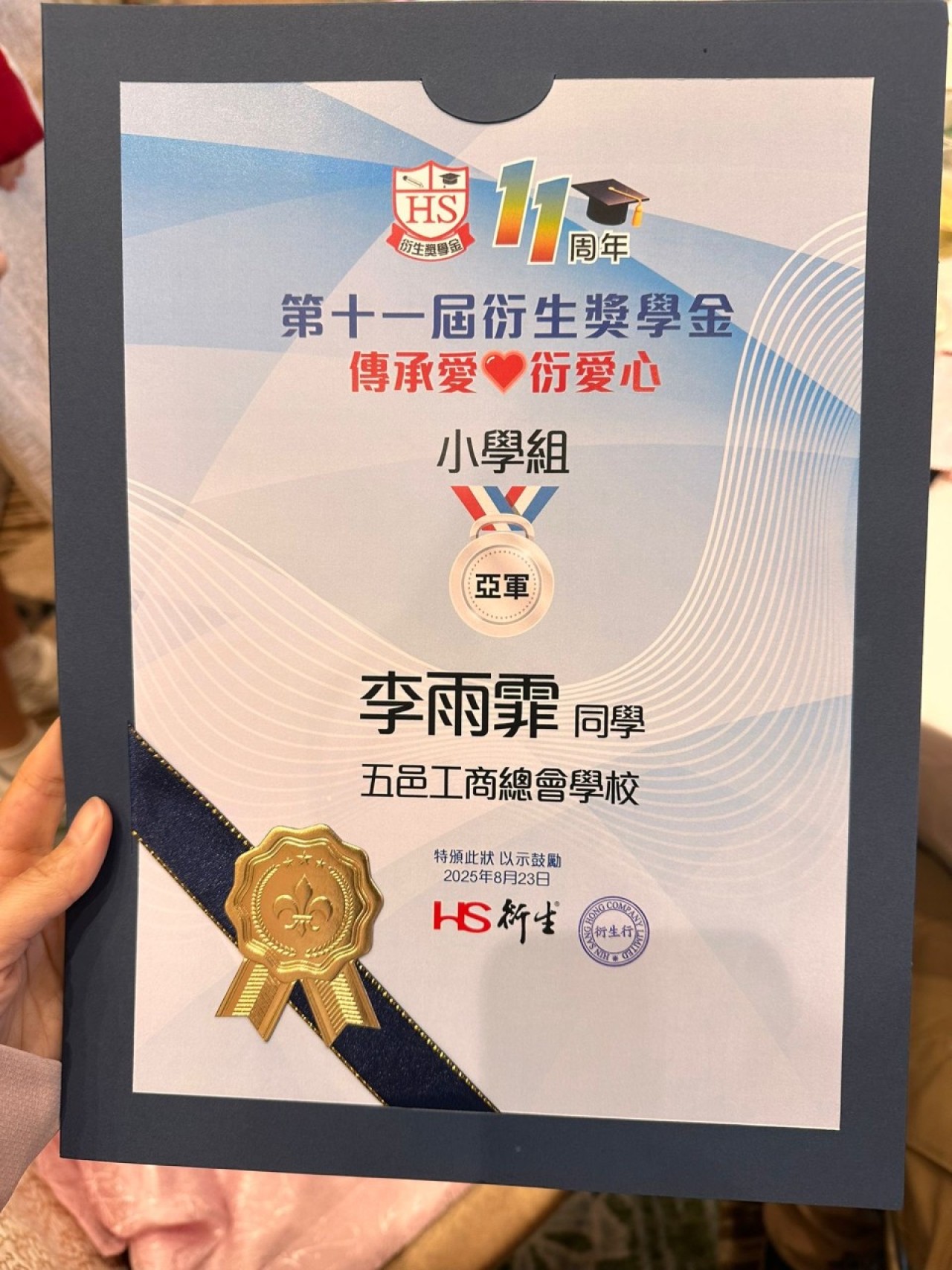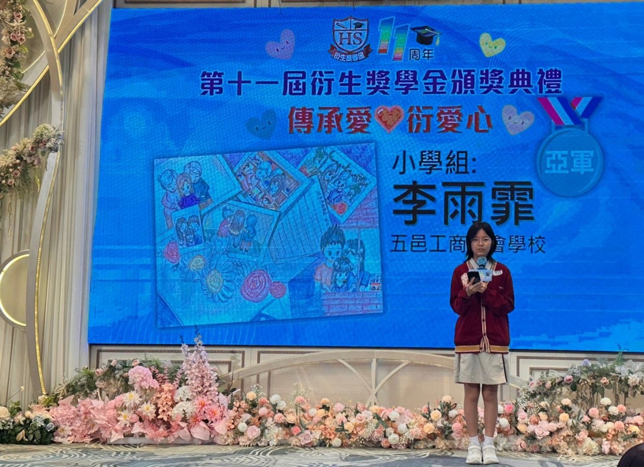 2025-08-23 舉行日期:2025年8月23日活動名稱︰第十一屆衍生獎學金頒獎典禮 活動詳情︰本校6B班的李雨霏同學參加了「第十一屆衍生獎學金」比賽,表現優異,榮獲亞軍。本屆衍生獎學金的主題為「傳承愛‧『衍』愛心」,雨霏以畫作表達對父母深厚的愛意,感謝他們的辛勤養育。