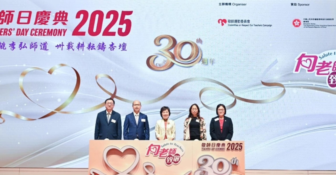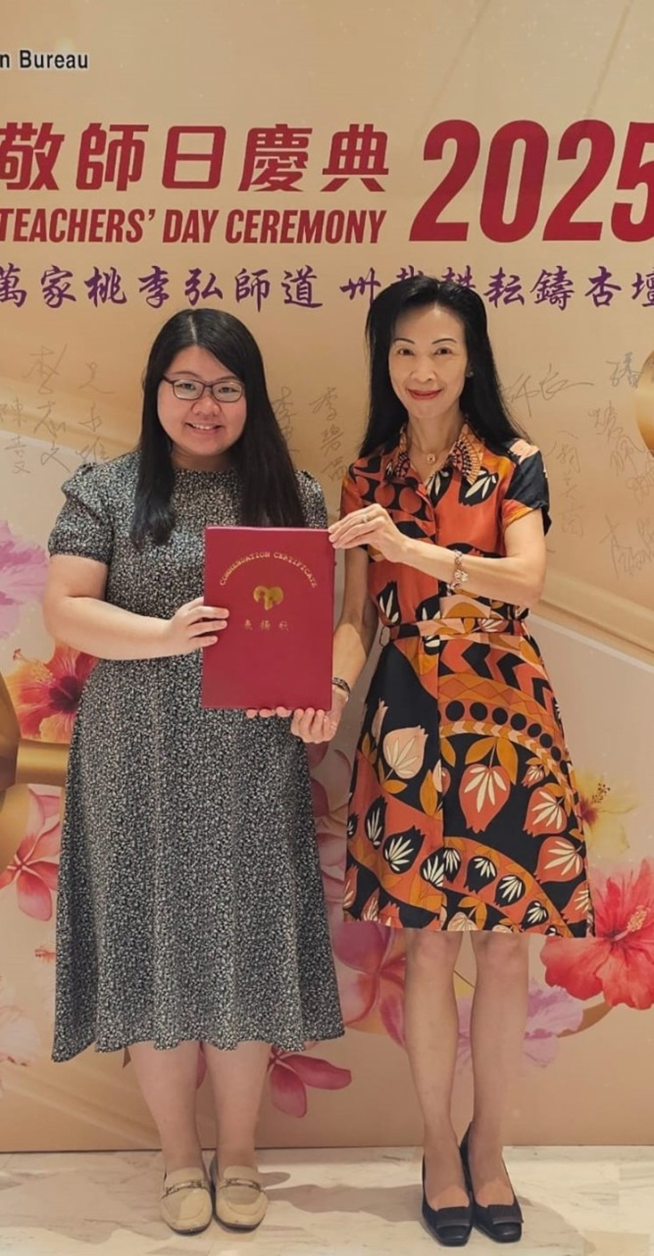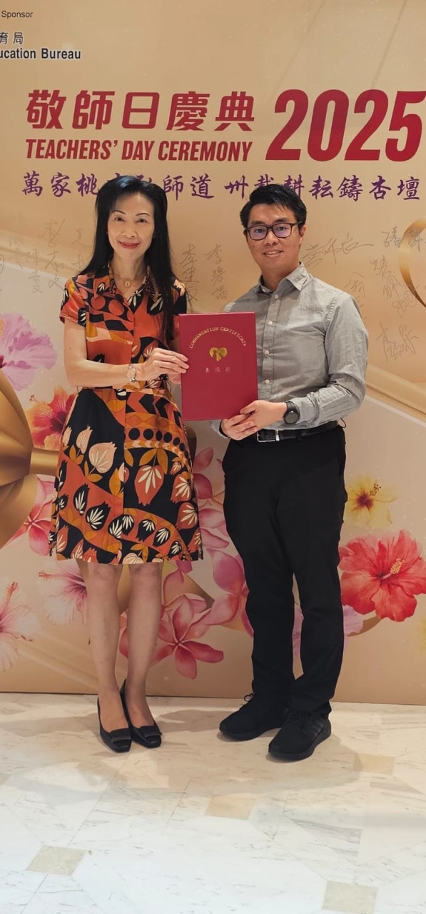 2025-09-26 舉行日期:2025年9月26日活動名稱︰敬師日典禮2025 活動詳情︰香港敬師運動委員會舉辦了「向老師致敬2025─敬師日慶典」,恭賀本校兩位教師在「第30屆表揚教師計畫」中獲獎。家教會譚主席親臨現場祝賀,令人倍感欣喜!